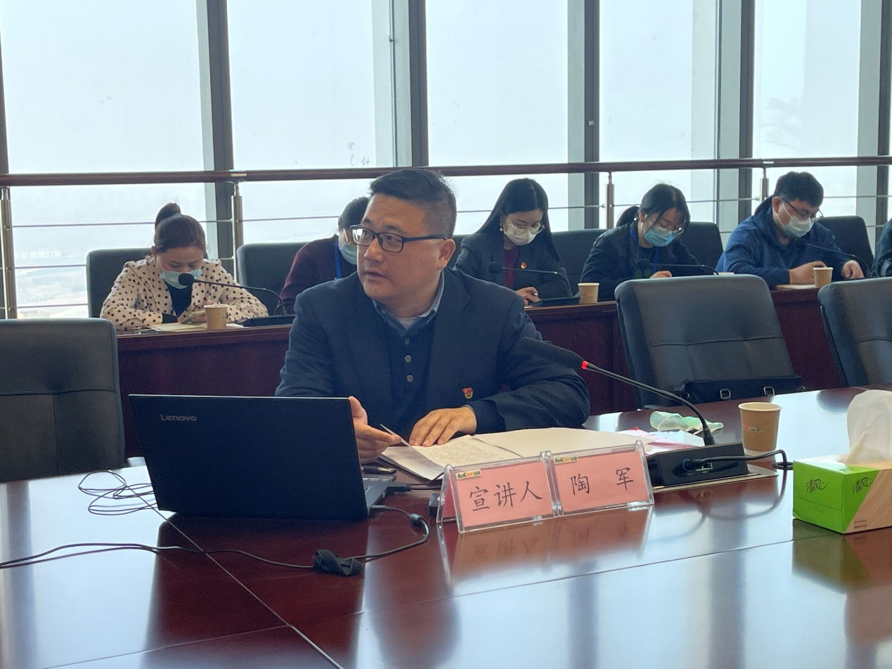 為深入學習貫徹黨的十九屆六中全會精神,持續鞏固拓展黨史學習教育成果,根據海螺集團黨委統一部署,海螺集團黨的十九屆六中全會精神暨省第十一次黨代會精神專題宣講報告會于1月18日在安糧集團舉行。海螺集團“舉旗幟 送理論”宣講團成員、安徽國貿黨委副書記陶軍作專題宣講。安徽國貿黨委委員、安糧集團黨委書記曹訓立主持報告會,安糧集團有關班子成員、直屬黨支部和安糧控股黨支部部分黨員代表參加學習。