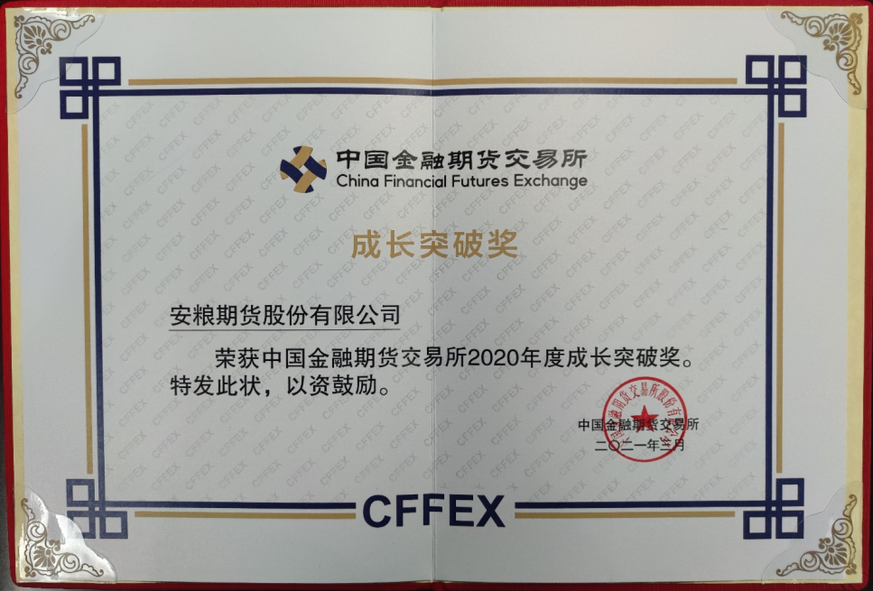 安糧期貨榮獲中國金融期貨交易所2020年度“成長突破獎”