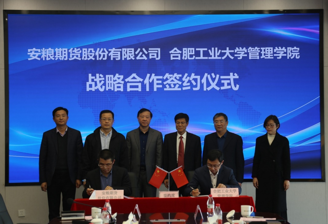 安糧期貨黨支部書記、董事長朱中文與合肥工業大學管理學院院長胡笑旋代表雙方簽署戰略合作協議。安糧期貨黨支部副書記、總經理韓文輝與合肥工業大學管理學院黨委書記郭志勇代表雙方交接“就業實習基地”牌匾。