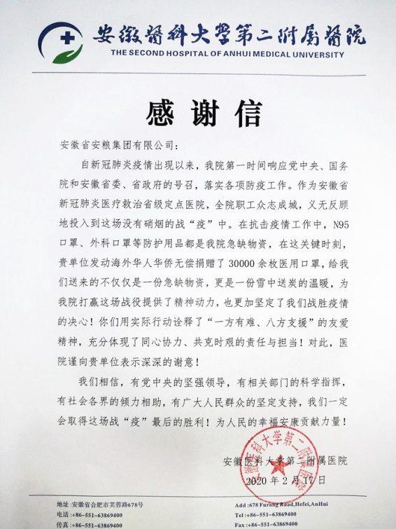 據悉,安糧集團聯合陳明祥先生另行籌集的3萬只醫用口罩,近日已定向捐贈安徽醫科大學第二附屬醫院。