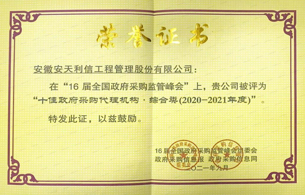 榮獲“全國十佳政府采購代理機構”榮譽