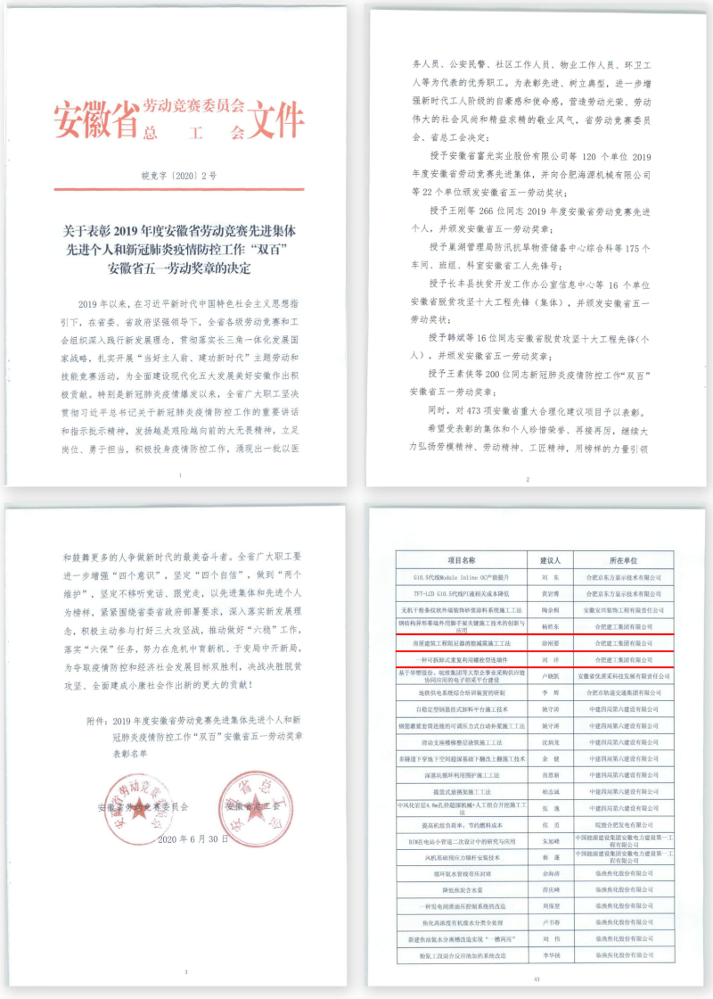 近日,由安徽省勞動競賽委員會、安徽省總工會組織評選的2019年安徽省重大合理化建議項目獎揭曉,安徽國貿集團所屬合肥建工公司首次申報的《鋼結構異形幕墻外用腳手架關鍵施工技術的創新與應用》(楊皓東)、《房屋建筑工程阻尼器消能減震施工工法》(涂剛要)和《一種可拆卸式重復利用螺栓型連墻件》(劉洋)均榜上有名。